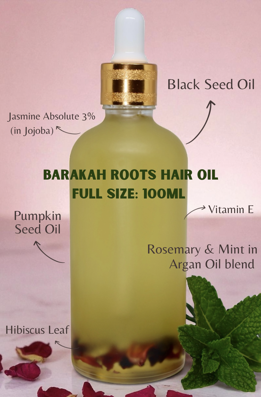Experience the divine touch of nature with Barakah Roots Hair Oil, a carefully crafted blend inspired by the timeless wisdom of Islamic medicine. Enriched with Black Seed oil, renowned as “the remedy for everything except death” in Hadith, alongside nutrient rich Argan, Pumpkin Seed, and Jojoba oils, this oil deeply nourishes, strengthens, and revitalizes hair from root to tip.